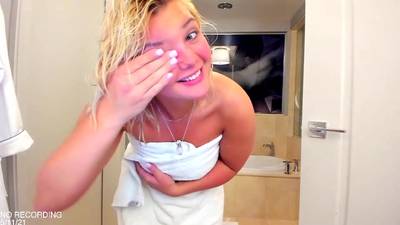 Beautiful sexy blonde model with big boobs, undresses in front of the camera getting ready to take a bath in the tub.