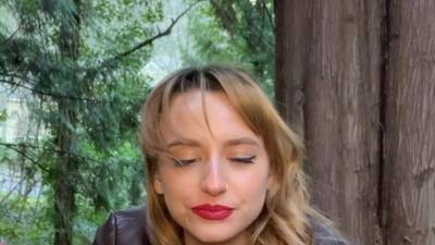 This skinny, long-legged amateur girl, smokes and masturbates her hairy pussy with a sex toy in the woods near a big tree.