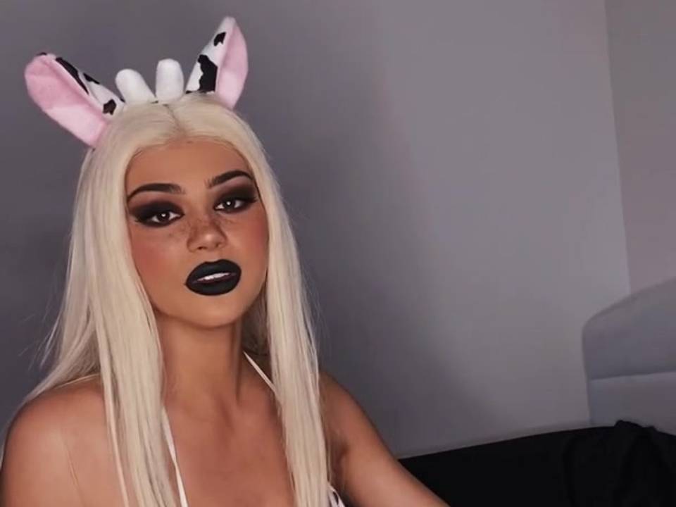 Blonde chick in sexy cow bikini cosplay teases you while she has a conversation with her step brother.