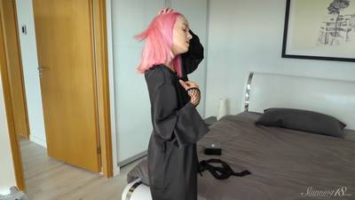 Teen Kiara J has pink hair and she is horny. She has got a mesh suit and on the bed, she grabs a pillow and passionately masturbates with it until she orgasms.