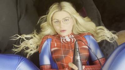 Blonde amateur girl in a Spiderman costume