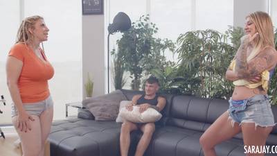 Two bawdy blonde sluts, Lolly Dames and vixen MILF Sara Jay, discover that their cousin has a big dick! They suck him off and fuck him, threesome style