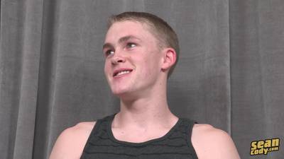 Rod, a male with blonde hair undresses in front of the camera, arranges himself on the sofa and intensely, jerks off his cock.