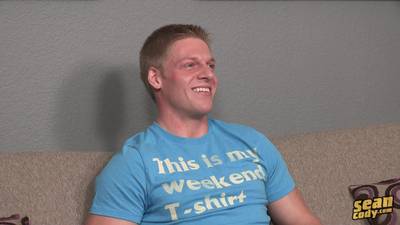 Hunter, a blonde with a toned chest, jerks off his dick and cums all over himself, flexing his muscles.