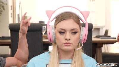 Amber Moore, a blonde and sexy gamer, decides that is more fun to be fucked by two men and have her face covered with sperm, instead of playing.