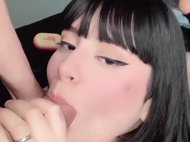 A beautiful brunette in sexy black lingerie, kneels before her lover with his penis in her mouth and swallows it like a pro, in her amateur porn video.