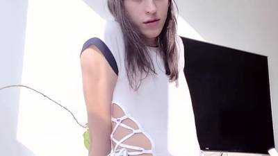 An attractive trans amateur brunette, seduce us by appearing in a mini-skirt, and under it, she suddenly pulls out a big cock to jerk off solo, for you.