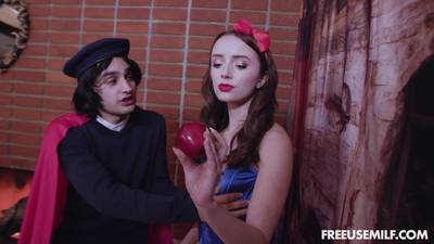 The slut dresses up as Snow White and will suck his long cock well. The guy fucks her well in front of the fire and makes her moan