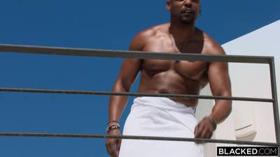 Black chocolate man woke up from the noise of the pool. There was two snowbunnies waiting for him! He comes down and makes both of them suck his BBC!