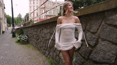 A teen blonde, slim slut in a white dress shows off her body and exposes her boobs and bubble butt in public and doesn't care if anyone sees her, bawdy!