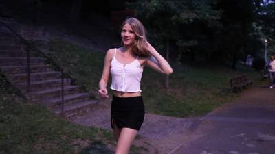 Teen blonde girl tours the city and shows off her body