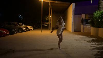 This petite teen blonde takes a shower, puts on a sexy white dress and stilettos to pick up a customer at a party in. She waits for him in the street.