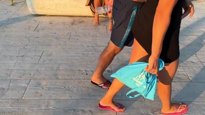 Tanned sexy blonde walks barefoot on a public beach