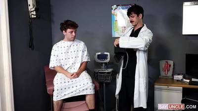 The doctor makes his patient bend over so he could stick his finger to do a prostate exam. But it escalates into the doctor pulling out his cock to jerk off!