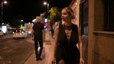 Sexy blonde with big tits shows her beautiful body in public. Naked, she walks at night through the streets of the city, She looks very exciting at night!