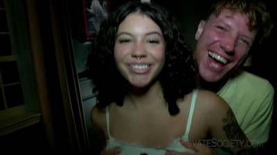 This brunette babe came to meet her friend! He caresses her small tits then moves down to touch her pussy! She then gets on her knees and swallows his cock