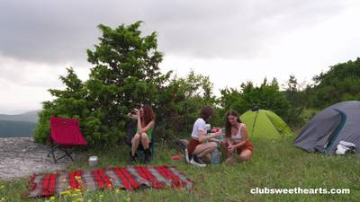 These four teen friends arranged a hiking trip! They got a spot to camp and once they're settled they start having fun, sucking and licking each other's pussies