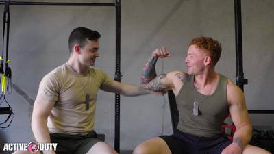 Private Jeremiah Cruze worships Damien King’s thick cock after a heavy workout, gagging deep before his tight ass gets pounded raw