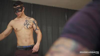 Masked brunette teen takes off his shirt then stands there waiting for this man to pull out his cock and suck it until it's rock hard