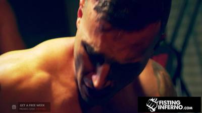 After sticking a sextoy in his penis, this man lays down to get fucked by two muscular tattooed and hairy man! Just as he likes it