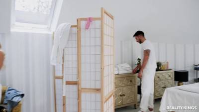 Blonde Maya Rose strips for masseur Francis X, getting her big tits and pussy rubbed with oil. She sucks his cock and gets her pussy fingered
