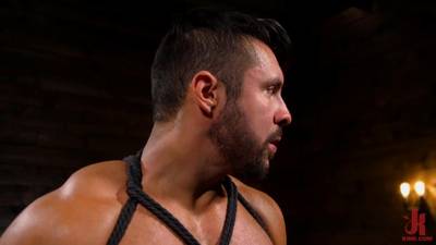 Submissive Seth Santoro gets tied up in a BDSM scenario! Christian Wilde then bends him over and fucks him anal bareback