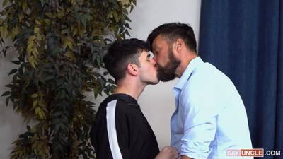 This student is jerking off, smelling his professor's coat while waiting for him! Once he arrives, they start making out and it quickly leads to anal bareback