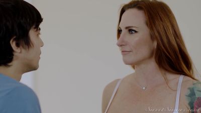 Redhead Sophia Locke's husband is away and she's been feeling very horny. So she wants her stepson Ricky Spanish to suck her fat tits!