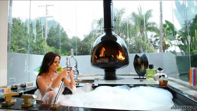 This beautiful brunette is very sensual while she is bathing in front of the fireplace. So she masturbates with a dildo to make herself feel more relaxed.