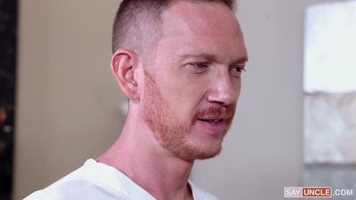 This redhead masseur is a horny freak. He massages his client's feet then makes them give him a footjob! He then gives them a handjob while they suck his cock!