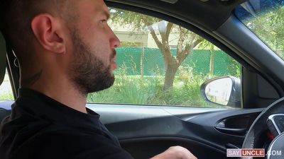 This latino uber driver and his passenger are feeling very horny so they hop in the backseat and start sucking dick in the outdoors!