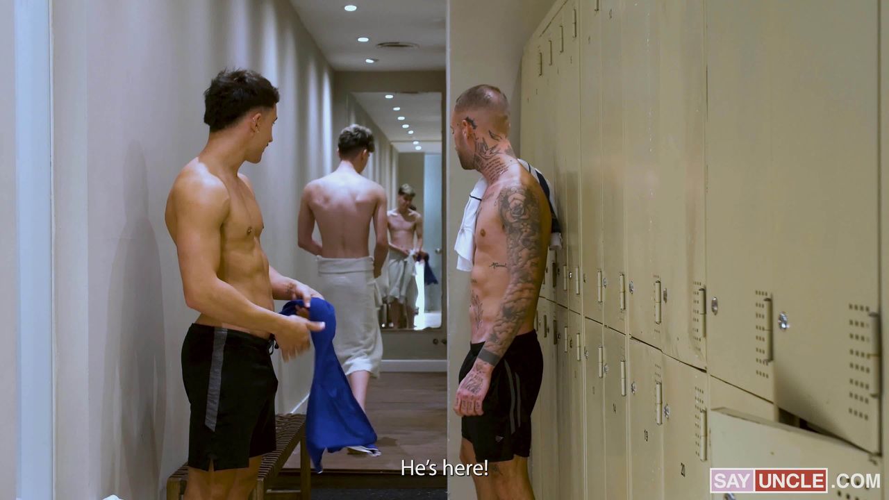 After a soccer game, these teens get together in a locker room and make the blonde get down on his knees to suck them both!