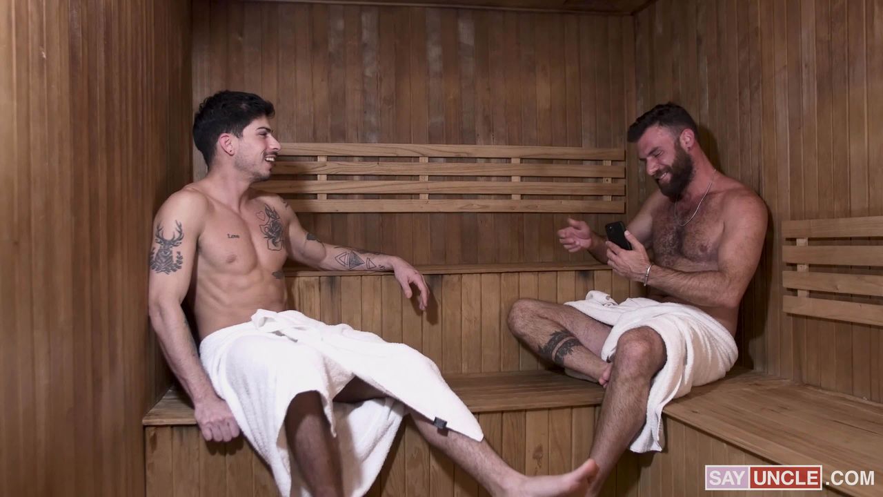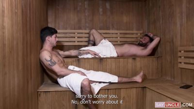 In the sauna, these man are having a bit of small talk but quickly their talk leads into them sucking each other's cocks