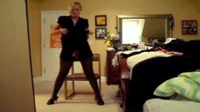 This gorgeous blonde enjoys dancing and caressing herself for us as she's wearing her stockings and her heels in front of the camera