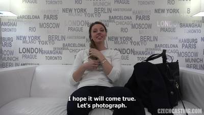 She starts out being interviewed and ends up sucking his cock and getting fucked in a number of positions.
