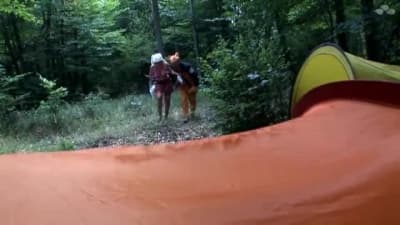These two horny women are camping with a friend and they will fuck each other like lesbians so that he gets excited when he sees them.