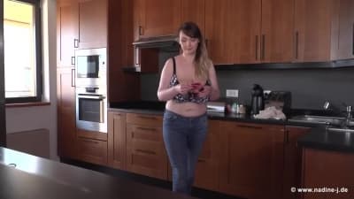 Nadine enjoys playing with her huge milky tits. She swings them, massages them, sucks them and milks them. We love the naked tits and jeans!