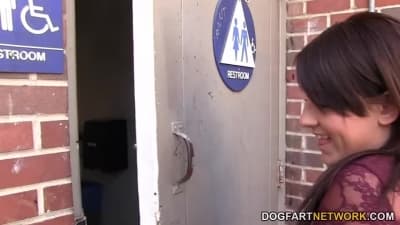 She goes to a restroom and sees a hole in the wall from which a black cock will emerge. She wastes no time and starts sucking him while masturbating!