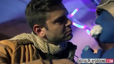 In this parody scene, a beautiful blue skinned alien girl is caught and tortured - by two guys using their cocks to penetrate her mouth and pussy