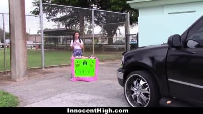 This petite brunette with cute hair bunches gets a thorough fucking from a big strong man. He tosses her around like a rag doll as he rams her pussy