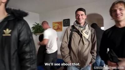 Petite brunette with glasses invites a host of men into her little flat. They proceed to fuck her in turn, gradually covering her with their cum