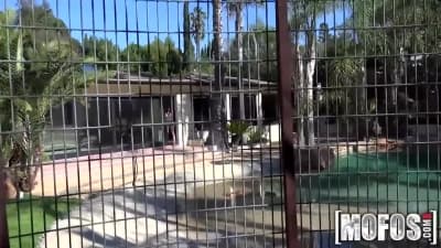 She showed him the tits through the cage, then went to give him blowjob outdoors then fucked eachothers