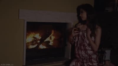 Setting there drinking wine next to fire when she felt horny start touching her self and getting naked