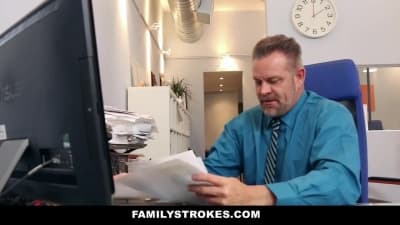 In this office there is a woman and an old man. The woman tries little by little to get the old man to look at her beautiful ass, and it works!