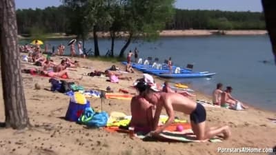 This cute brunette is playing with herself in the middle of the part just because its more horny