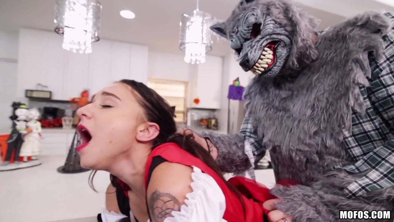 She was wearing the little red riding hood and sucking her boyfriend's big hard cock while wearing the wolf cosplay to have ana amazing sex