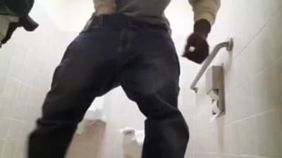 This hot black guy enjoys his moment of pleasure in the public bathroom as he wanks himself off until he cums