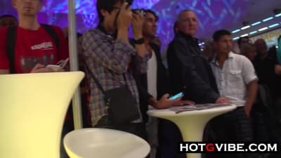 This is a big crowd all around this hot performer, a blonde sexy girl masturbating with her sex toys
