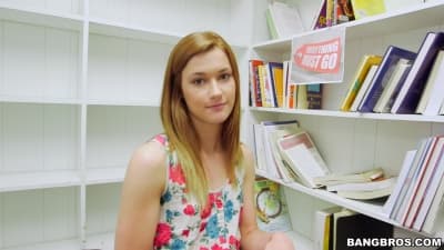 She's a curious teen looking in the book shelves for a sex book got sad not finding it but she got a teacher that is ready to fuck her by the book