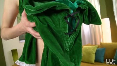 She took the lucky Irish leprechaun outfit and puts it on with her massive boobs showing and starts masturbating